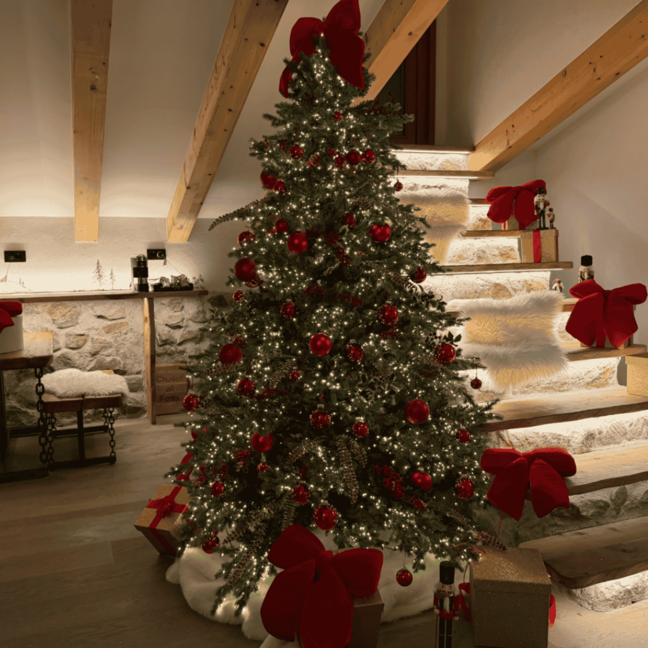 Experience the magic of Christmas with your room decorated with two Christmas trees, one large decorated and one small illuminated.